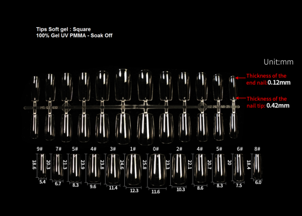 • Tips Soft Gel Square ( punta cuadrada)  ultradelgados y flexibles .Fabricados 100% PMMA  Resina Gel UV – Soak off – ultra transparente y flexible, que traspasa el 95% de la Luz UV para un polimerizado completo.