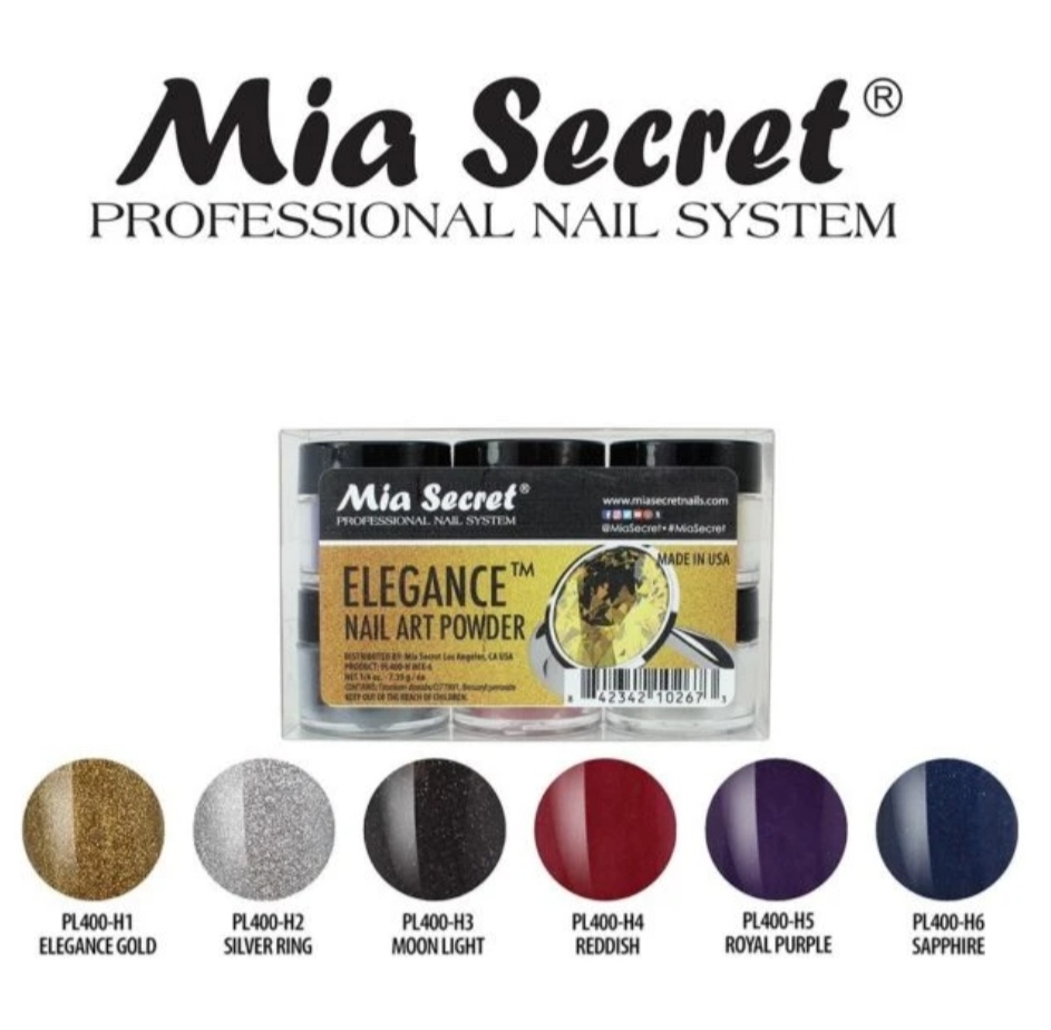 La colección de acrílico Elegance de Mia Secret incluye colores: Elegance Gold, Silver Ring, Moonlight, Reddish, Royal Purple y Sapphire.